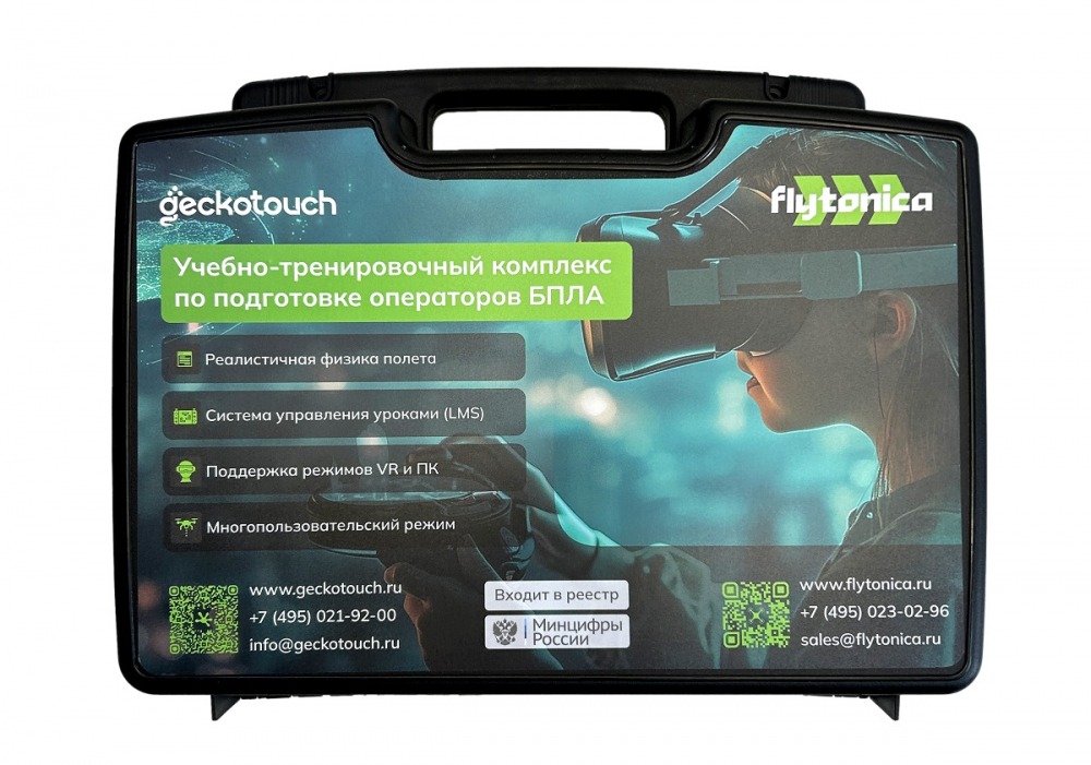Программно-аппаратный комплекс (ПАК) Flytonica — симулятор для отработки навыков пилотирования, достоверно имитирующий управление квадрокоптерами с реалистичными полетными заданиями, локациями и трассами (6 локаций: учебный стадион, лесная местность, городская инфраструктура, береговая линия, завод, ангар; 6 сценариев: пролет по флажкам, пролет по кольцам, доставка груза, фотографирование, поиск объектов с помощью тепловизора, свободный полет; 2 квадрокоптера на выбор).